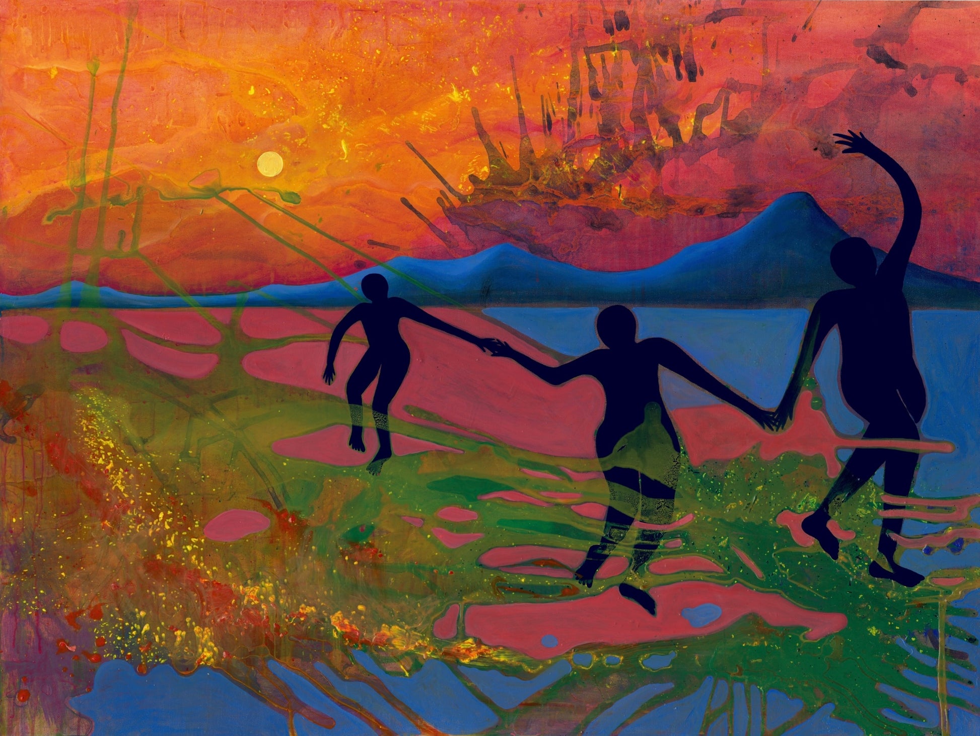 Dreamers is a mesmerizing painting inspired by a dream I had of dancing through a surreal dream world. The fluidity of the sky and ground merging, and the flatness of the figures symbolizes the dream state. Enter a surreal world with Dreamers.