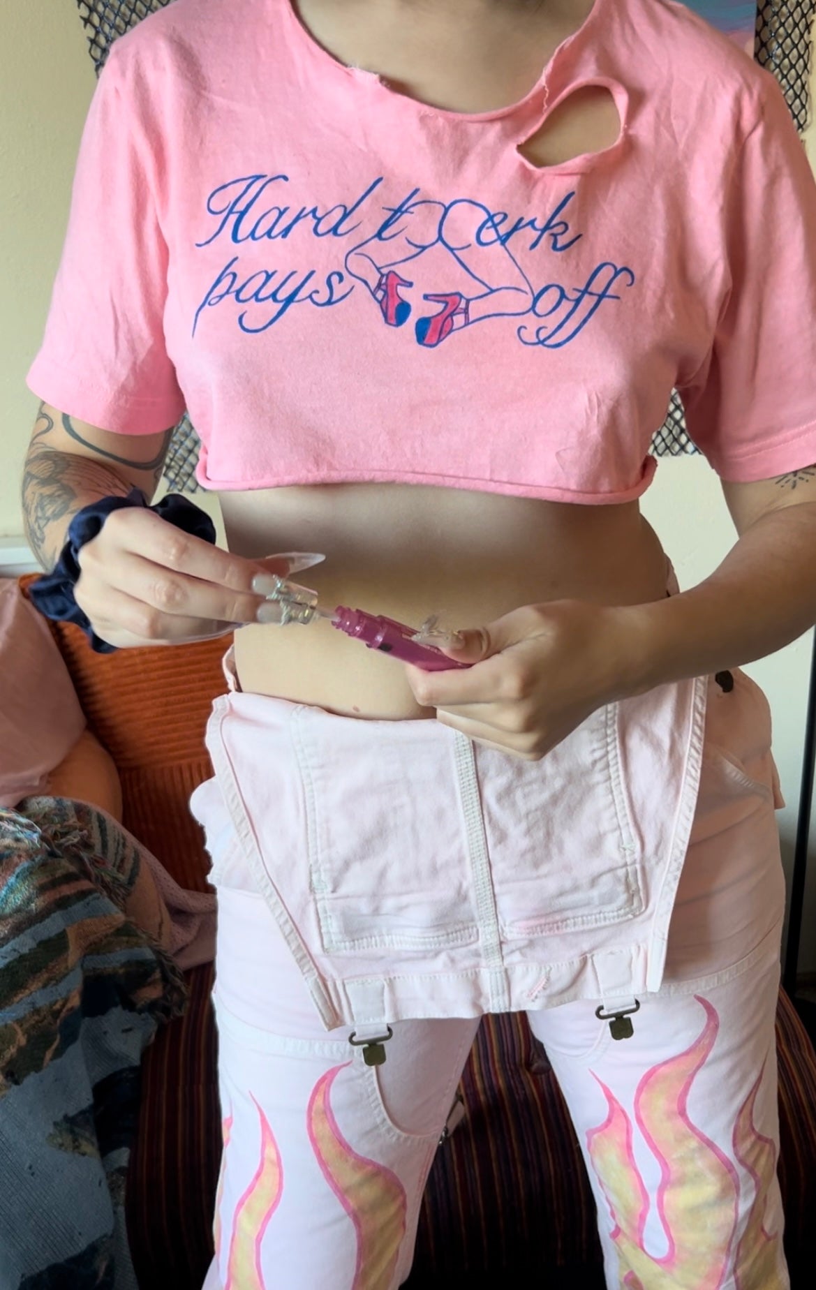 This “casual sexy” crop top is hand dyed and screen printed. The edges have a “worn” look to them through being cut and ripped. They aren’t traditionally sewn.