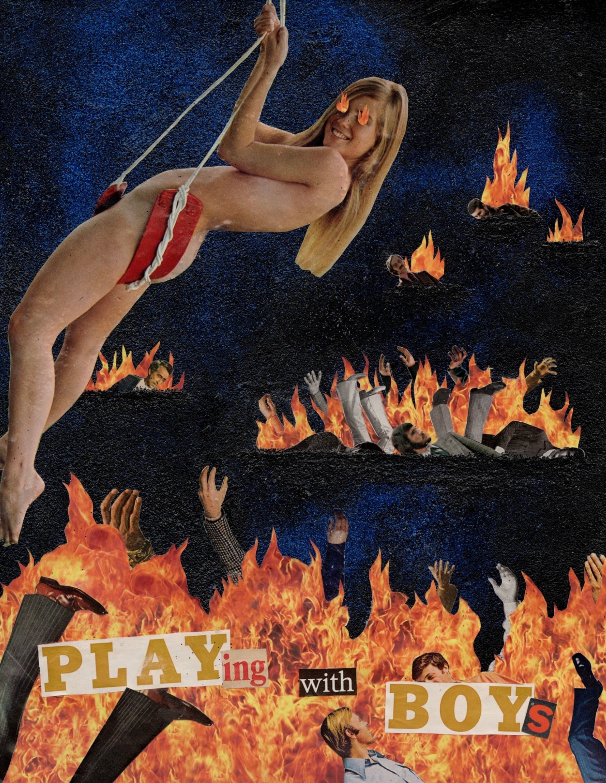 Let them Burn is a unique work of art created from playboy magazines, depicting a woman joyfully swinging over men engulfed in flames. This thought-provoking piece challenges societal norms and perceptions of gender and power. A must-have for any art lover looking for a bold and impactful piece.