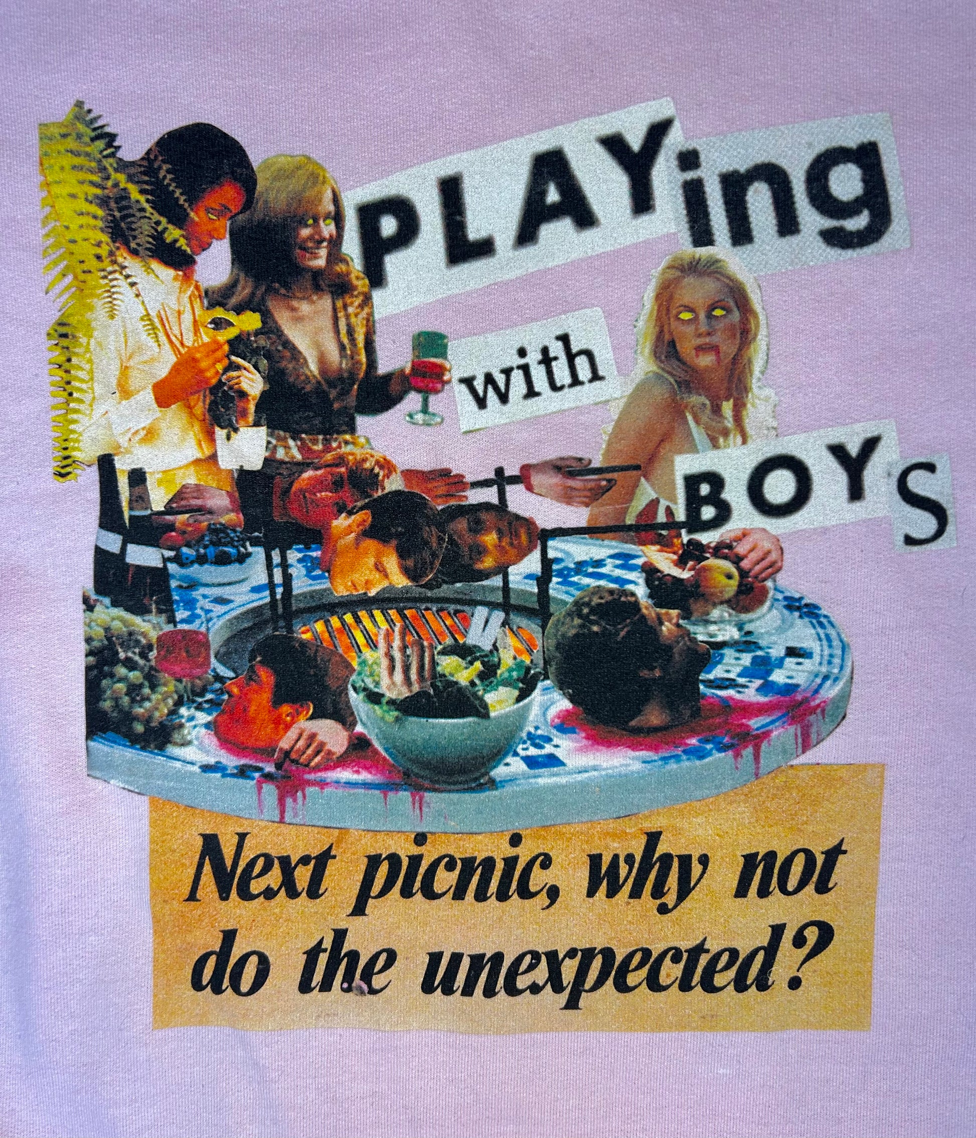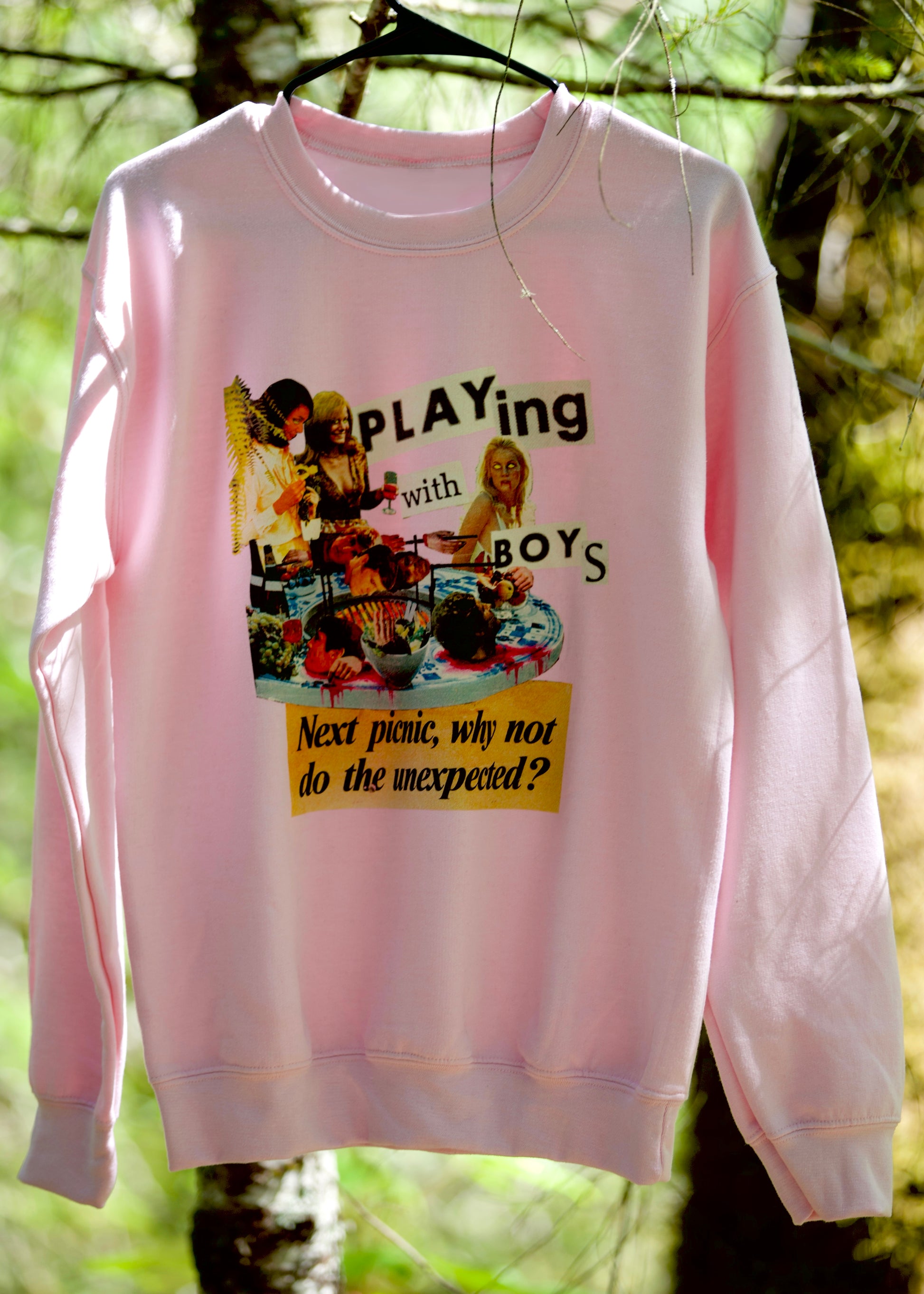 Transformed from old PlayBoy magazines, my collaged designs celebrate female empowerment. Now they have become “Playing with Boys”. I want to celebrate the women that were photographed, as they were some of the first sexual icons. Though my work, I have given them new life and have turned the tables on the idea of women being a product for men to enjoy. Now the Fems of the world have the control.