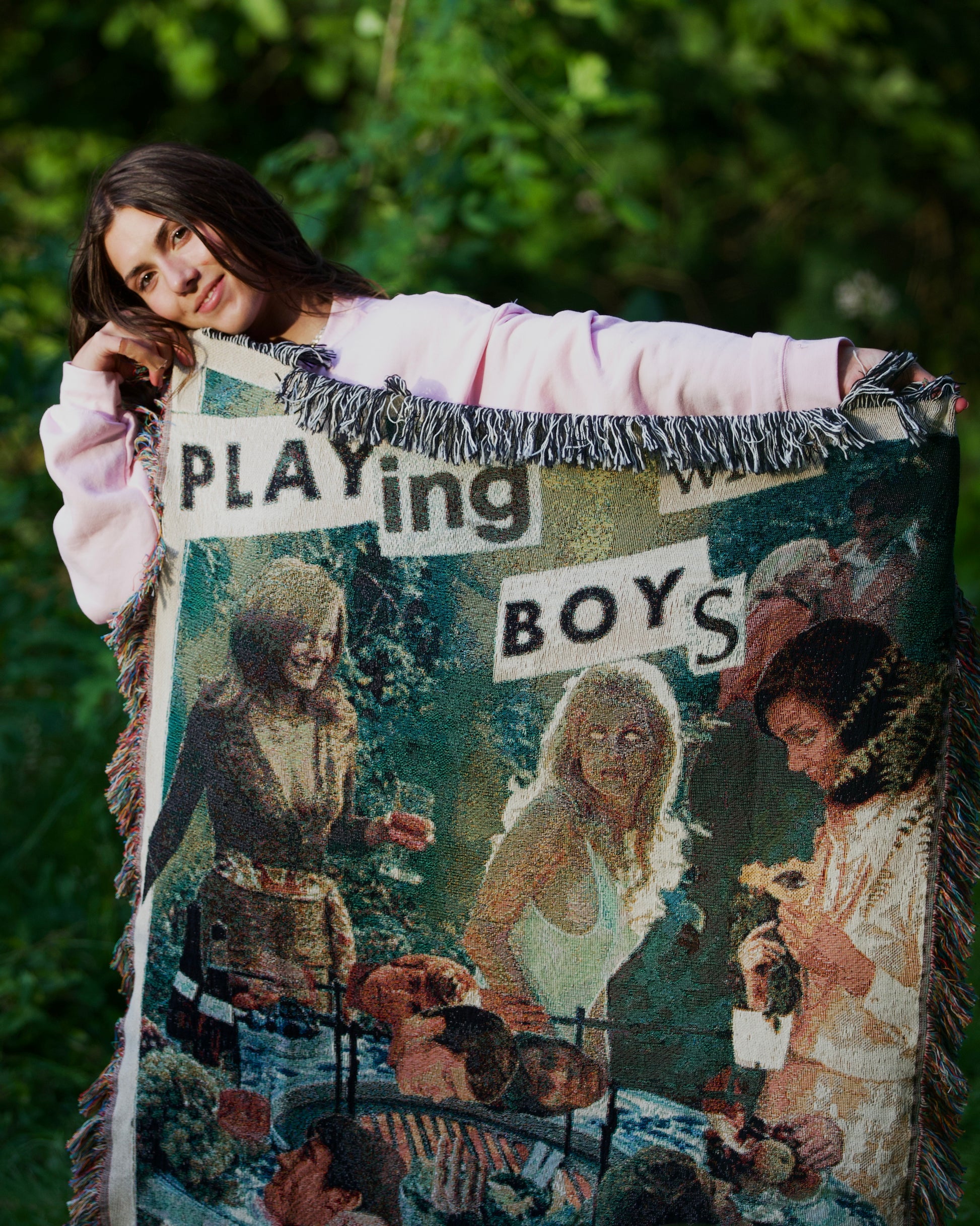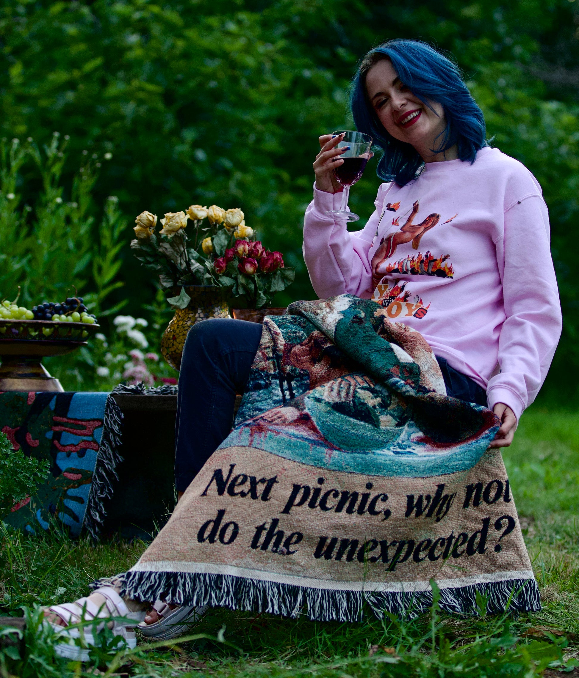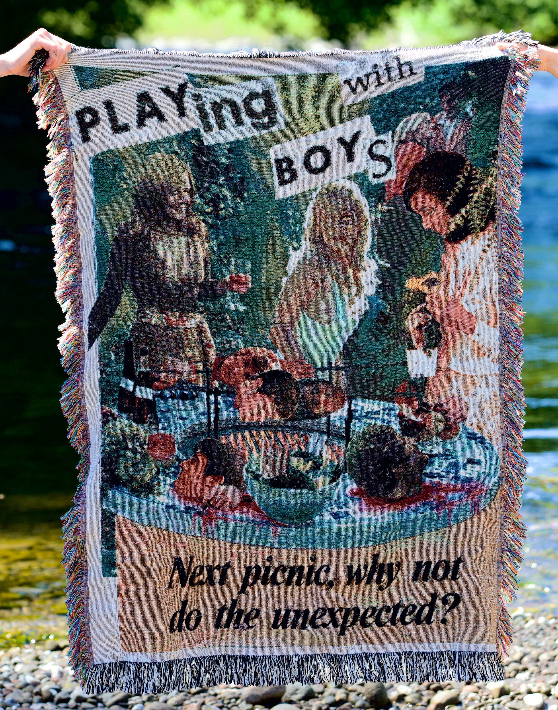 This tapestry showcases a powerful and thought-provoking piece of art, depicting women in a position of strength, confidently consuming men. Titled "Man Eater", it serves as a bold statement on gender roles and power dynamics.
